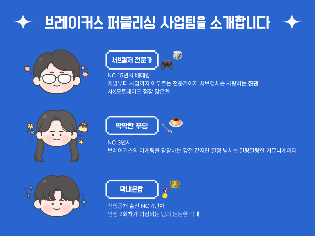 안녕하세요 저는 NC 15년차이고, 디렉터로 활약하다가 이번에 사업을 다시 담당하게 된 ‘서브컬처 전문가’입니다. 팀의 PD로서 전체적인 사업 방향을 리딩하고, 론칭까지 필요한 모든 과정을 꼼꼼히 챙기는 역할을 맡고 있어요.