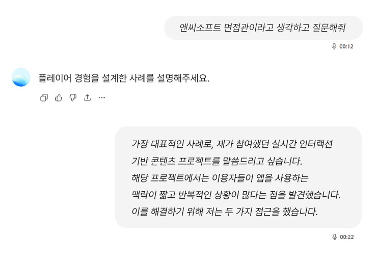 도전하는 개발자 저도 새로운 내용을 공부하기보다는, 이전 회사에서의 경험을 정리하고 말로 풀어 설명하는 데 집중했어요. 특히 ChatGPT의 음성 인식 기능을 활용해 실제 면접관과 대화하듯 연습했는데, 답변에 대한 피드백도 받을 수 있어서 매우 유용했습니다. 개발 경험과 기술적인 부분과 같은 직무 관련 질문 외에도 협업 스타일에 관한 질문, 팀에서 본인이 어떤 사람이라고 생각하는지, 성향이나 좋아하는 게임 등에 관한 질문을 받았는데 평소 생각한 바를 잘 정리해 둔 덕분에 자연스럽게 답변할 수 있었어요.