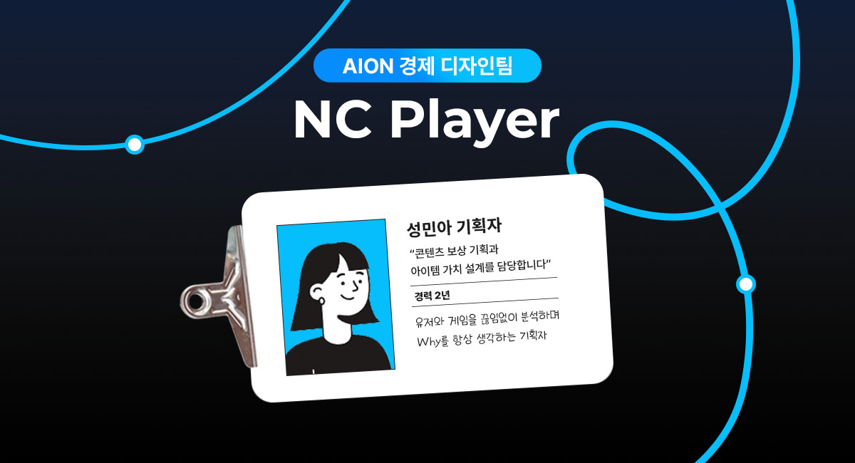 저는 AION 경제디자인팀에서 콘텐츠 보상 기획과 아이템 가치 설계를 담당하고 있습니다. 게임 내 경제가 유저 경험에 어떤 영향을 주는지 관찰하고, 적절한 가치와 보상이 유지되도록 구조를 설계하는 일입니다.