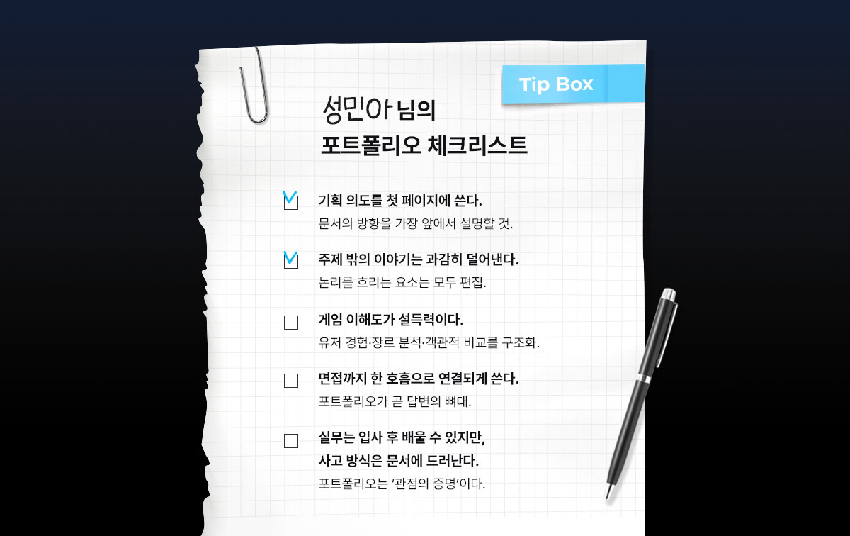 AION 경제디자인팀 성민아님은 포트폴리오를 “기획 역량의 결과물이 아니라 사고 과정의 증명”이라고 바라봅니다. 신입공채로 지원하여 여러 팀의 러브콜을 받을 만큼 높은 완성도를 지녔던 성민아님의 포트폴리오 경험을 토대로, 포트폴리오를 처음 준비하는 지원자들에게 작성 방향의 도움을 주고자 자리를 마련해 보았습니다. 기획자의 관점에서 포트폴리오를 구성 방법, 실전 팁까지 실질적인 인사이트를 지금 공개합니다.