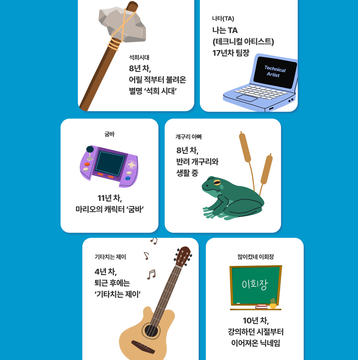 기타치는 제이 저는 이 팀의 ‘작업 환경의 퀄리티’가 큰 장점이라고 느꼈어요. 연출 직무다 보니 높은 퀄리티의 캐릭터, 애니메이션, UI 등 소스를 다룰 수 있다는 점이 좋았어요. 연출팀 뿐 아니라 프로젝트 전반 모든 파트의 결과물 퀄리티가 매우 높아요. 좋은 재료를 가지고 요리하는 셰프처럼 함께 일하는 즐거움이 있습니다.