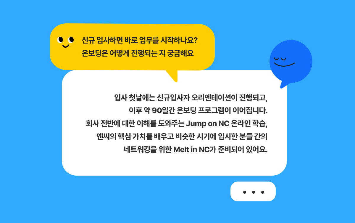 엔씨에서는 신규입사자분들이 새로운 환경에서 조금 더 편하게 적응하실 수 있도록