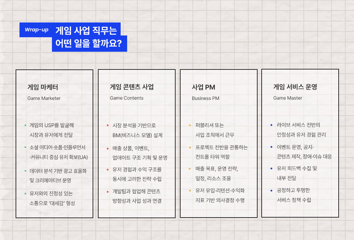 게임은 단순히 ‘잘 만든 게임’에서 끝나지 않습니다.누군가는 게임의 매력을 세상에 알리고, 수익 구조를 설계하며, 지금 이 순간에도 유저의 경험을 관리하고 개선하고 있습니다. 게임 사업 직무는 게임이 만들어진 이후, 유저들의 선택을 받기 위해 필요한 역할입니다. 출시 이후의 세계가 궁금하다면, 이 직무들을 주목해보세요!
