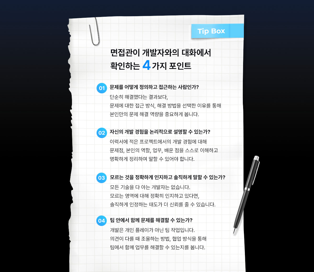 또 하나는 ‘솔직함’이에요. 모르는 것을 억지로 아는 것처럼 설명하기보다는 “이 부분은 제가 경험이 없어서 잘 모르겠습니다”라고 솔직하게 말하는 것이 오히려 좋다고 생각해요. 다른 분야도 그렇지만 개발이라는 분야에서도 모든 것을 다 알 수 없기 때문에 모르는 것을 인정하는 태도도 굉장히 중요하거든요.