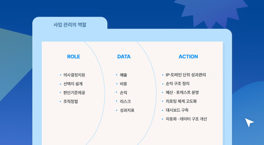 예산·비용 관리는 단순한 비용 통제라기보다는, 사업 목표를 달성하기 위해 한정된 자원을 어떻게 배분할 것인가를 함께 설계하는 과정이라고 보고 있죠. IP·제품·서비스 단위로 수익 구조를 분석하고 시장과 경쟁 환경을 비교해 인사이트를 제공하며, 다양한 시나리오를 정량적으로 검토해 불확실한 상황에서도 판단할 수 있도록 의사결정을 지원하는 역할도 하고요.